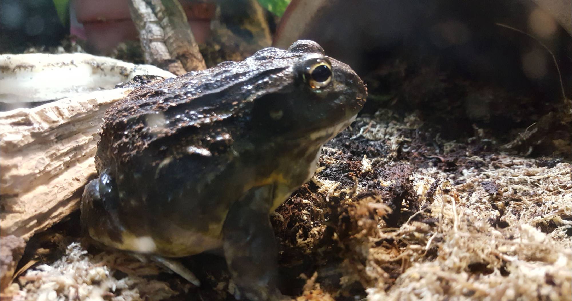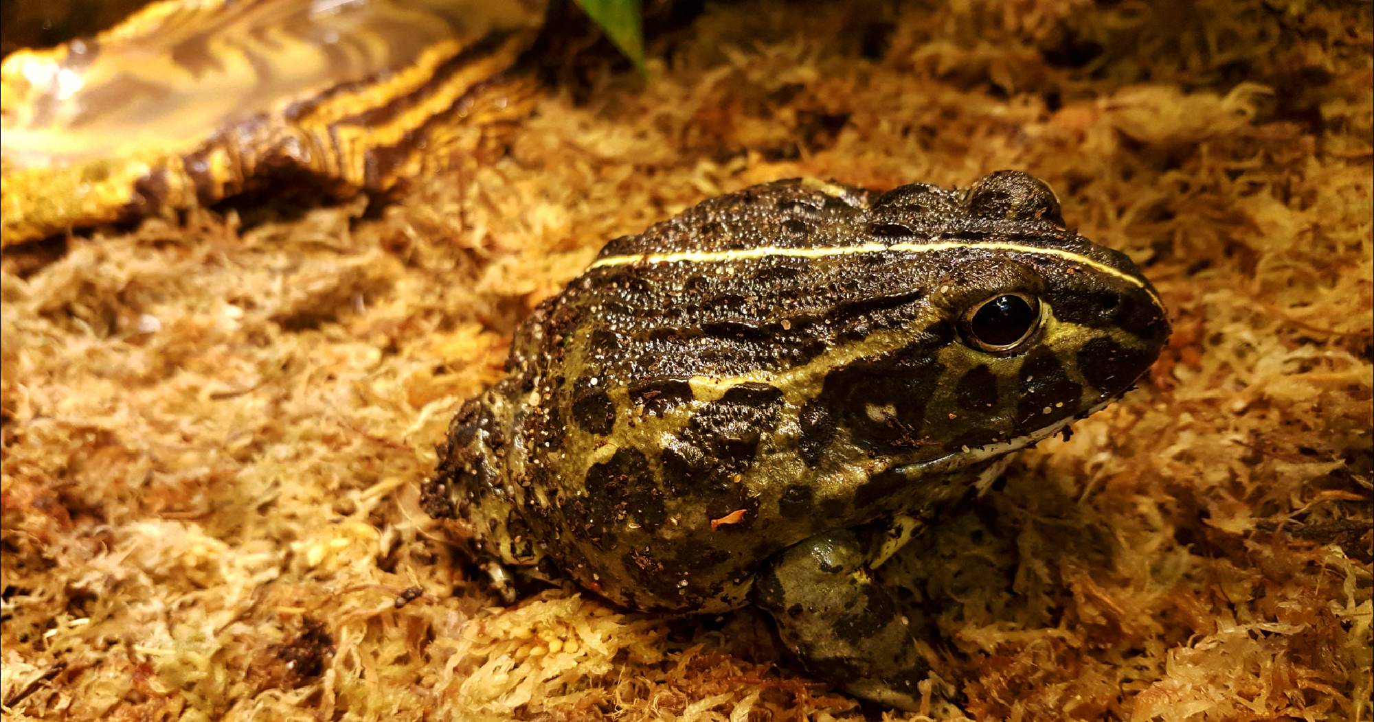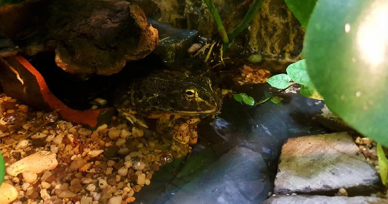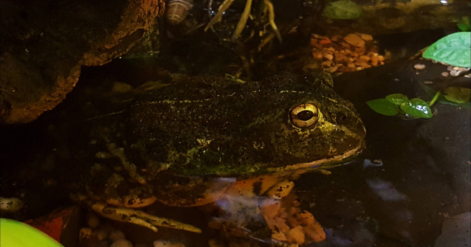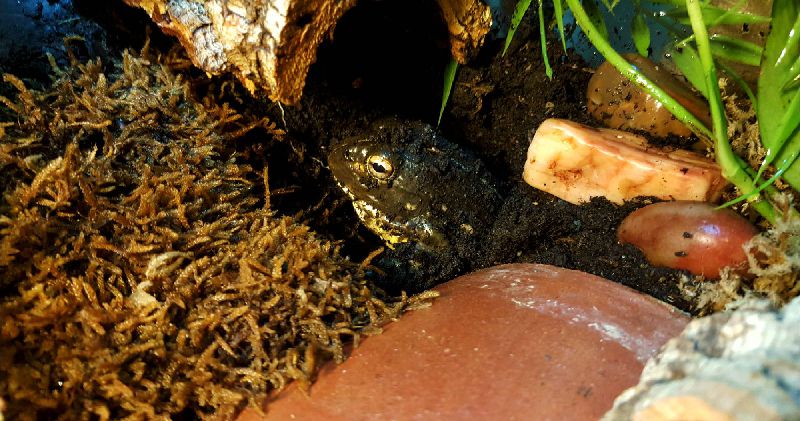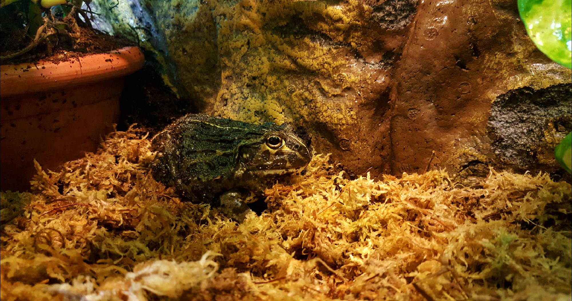 Dieser gefrässige Geselle oder Gesellin, Geschlecht habe ich noch nicht herrausgefunden, hat es mir besonder angetan. Er ist im November 2016 bei mir eingezogen und seitdem, bis auf 2 Ausnahmen, in Trockenruhe. Bei diesen Tieren ist wirklich Vorsicht geboten, da sie nach allem schnappen was sich bewegt, auch wenn es nicht ins Maul passen sollte. Eine Vergesellschaftung mit anderen Fröschen und Kröten ist nicht möglich, da alles als Futter angesehen wird. Gekauft habe ich Ihn/Sie von einer Familie die wohl nicht recht wusste welche Ausmaße dieser Frosch noch annehmen wird.