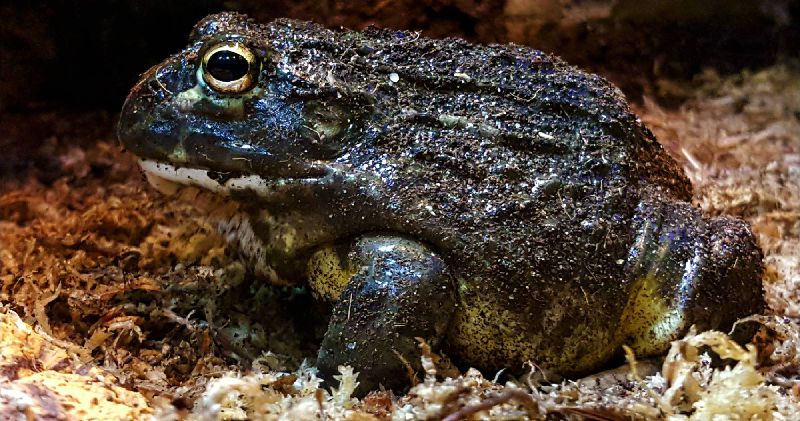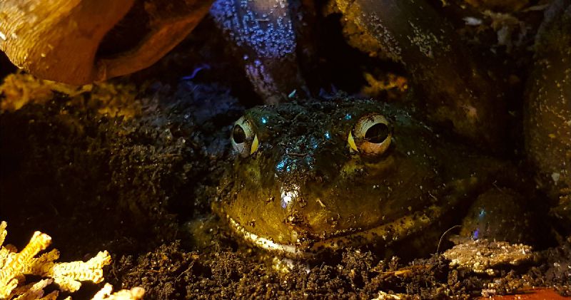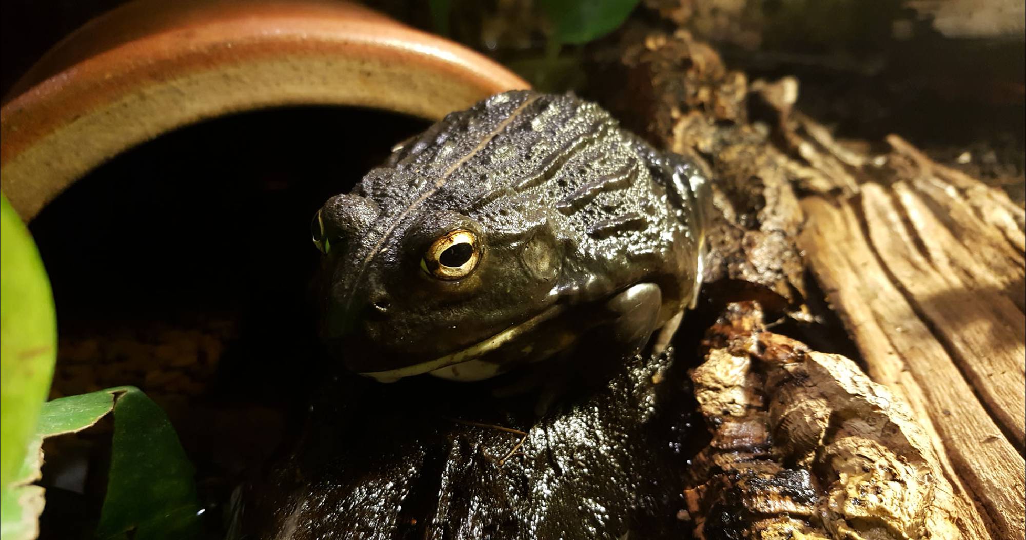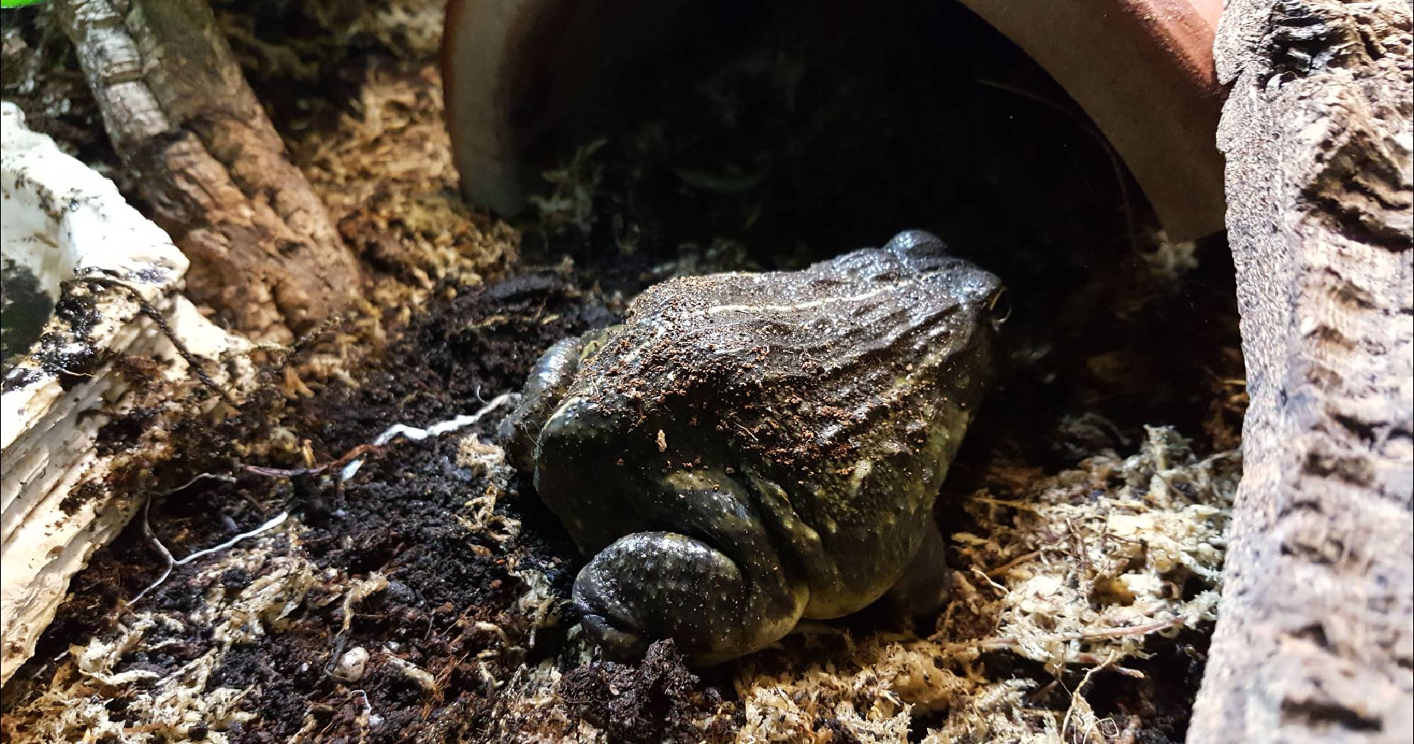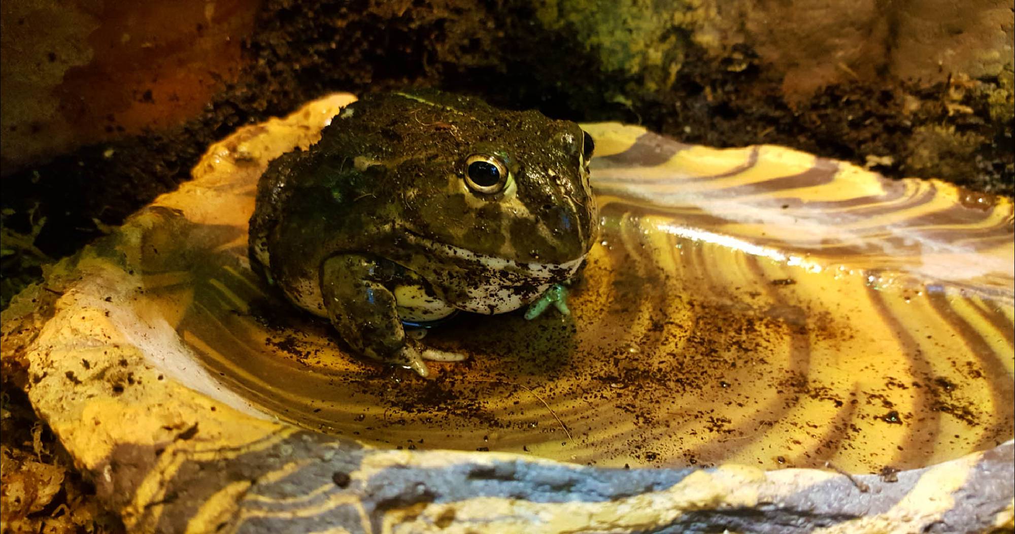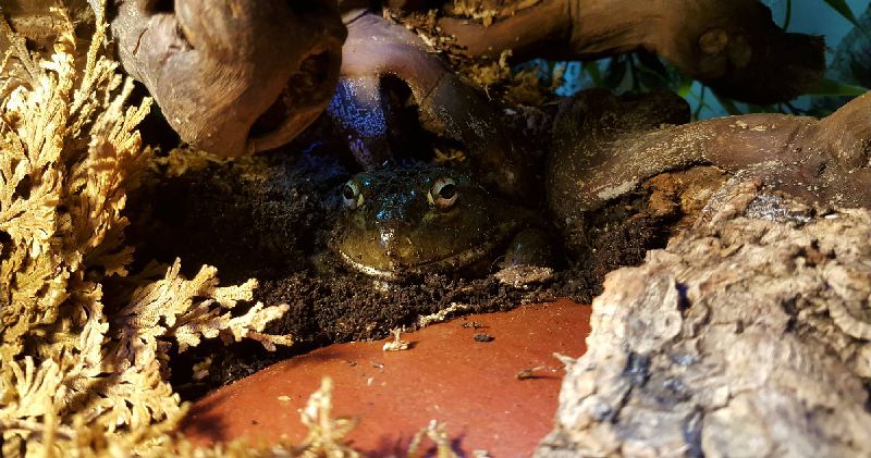Dieser gefrässige Geselle oder Gesellin, Geschlecht habe ich noch nicht herrausgefunden, hat es mir besonder angetan. Er ist im November 2016 bei mir eingezogen und seitdem, bis auf 2 Ausnahmen, in Trockenruhe. Bei diesen Tieren ist wirklich Vorsicht geboten, da sie nach allem schnappen was sich bewegt, auch wenn es nicht ins Maul passen sollte. Eine Vergesellschaftung mit anderen Fröschen und Kröten ist nicht möglich, da alles als Futter angesehen wird. Gekauft habe ich Ihn/Sie von einer Familie die wohl nicht recht wusste welche Ausmaße dieser Frosch noch annehmen wird.