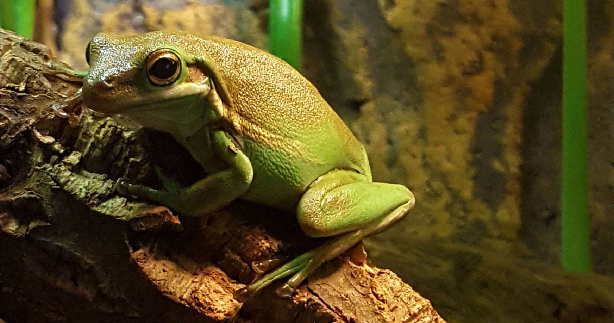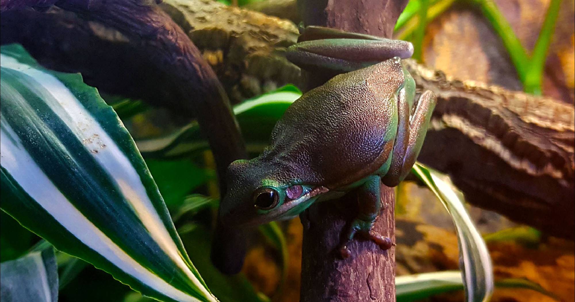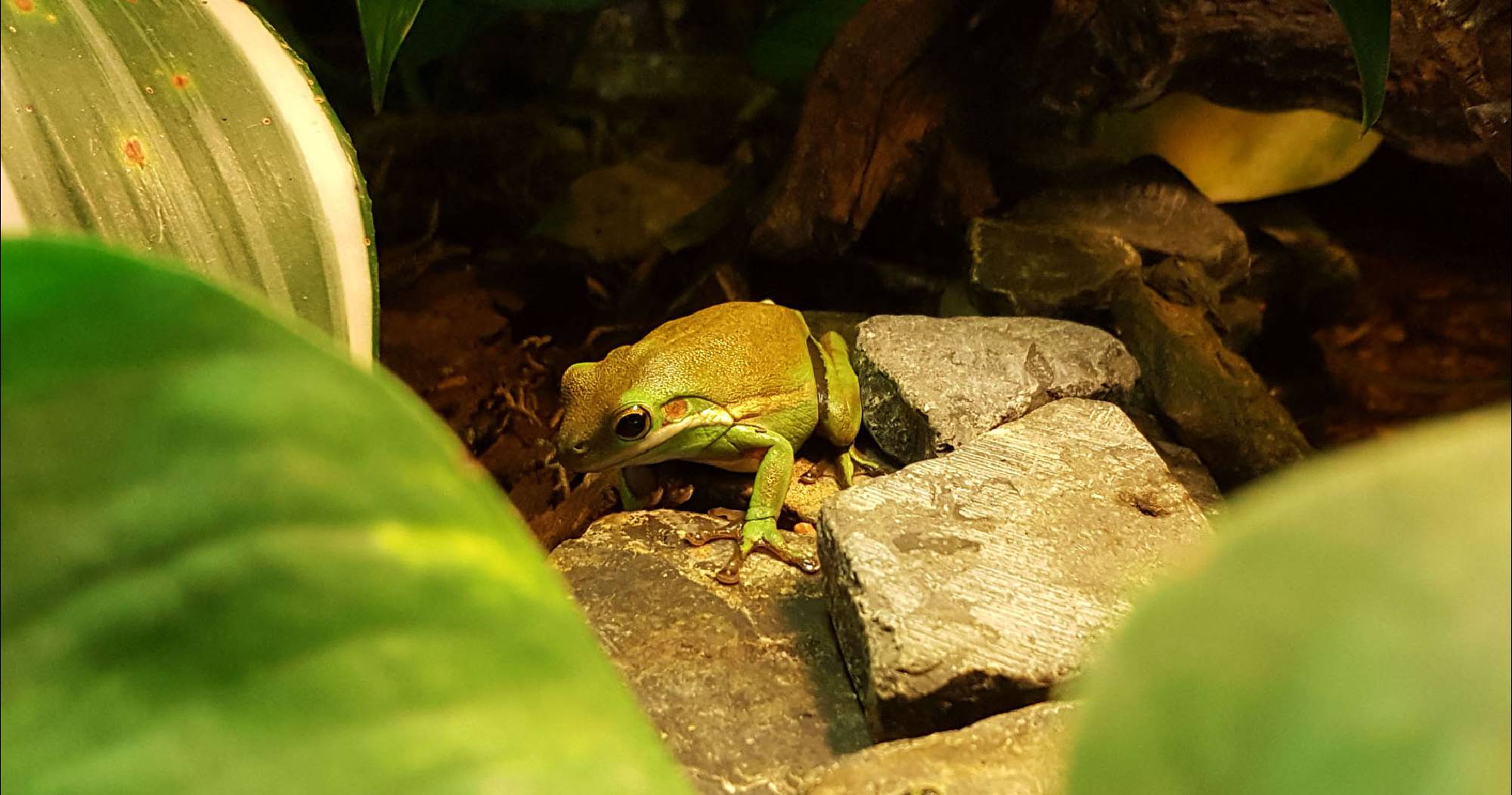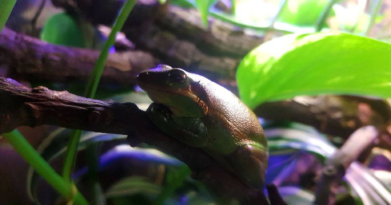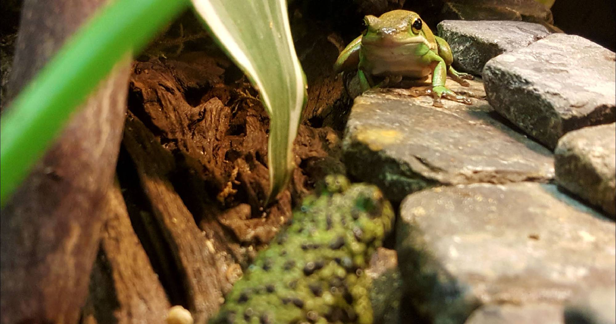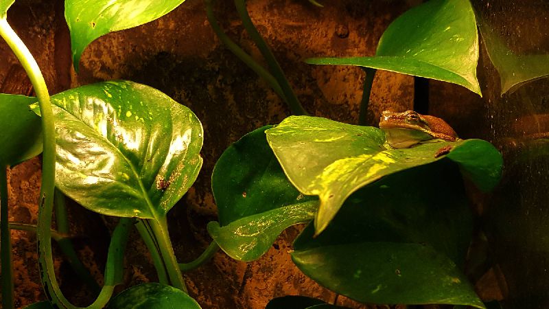 Der Laubfrosch 0.1 lebt seit September 2016 zusammen mit den Bombina Orientalis, und ist zuständig für die übrigen Futtertiere die sich im oberen Bereich des Terrariums angesammelt haben.
