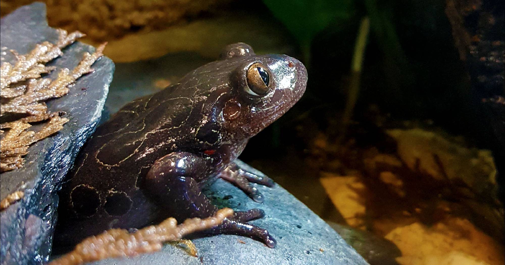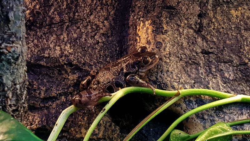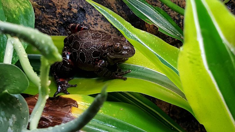 Aussehen: Grauer Rücken, schwarze hellumrandete Flecken, rote Flecken in der Innenseite der Gliedmaßen